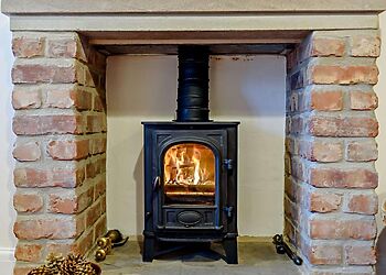 - Wood burner in stone fireplace
