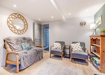 - Log burning stove and cosy sofas