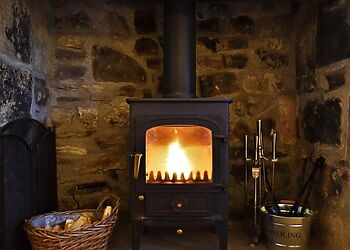 - Wood burner in stone fireplace